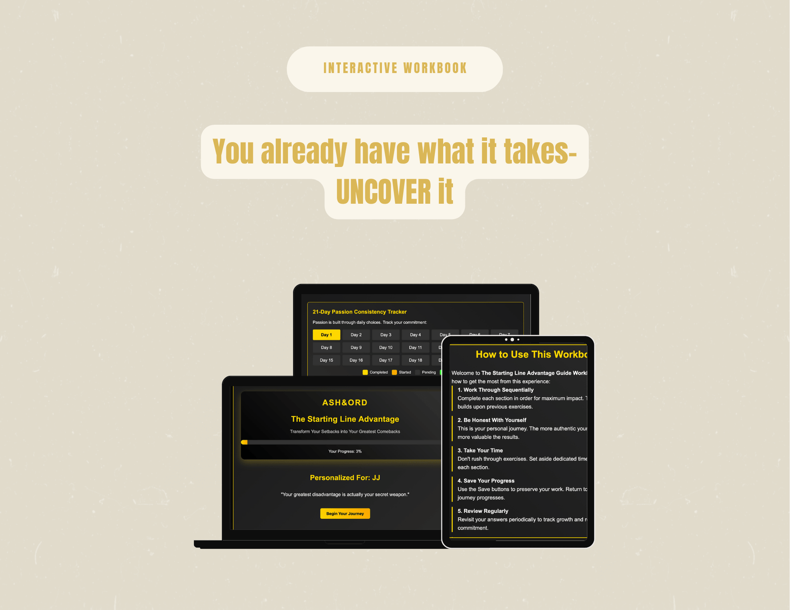 The Starting Line Advantage is more than a static PDF. It’s a fully interactive HTML workbook that saves your progress directly in your browser, allowing you to reflect, update, and track your growth in real-time.